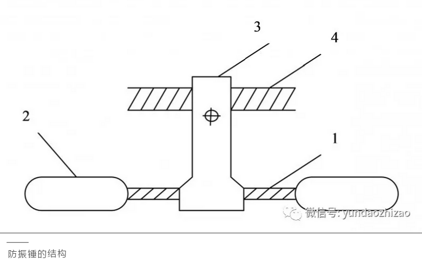 圖中數(shù)字標(biāo)注的部分分別為:1-鋼絞線,2-錘頭(一般是鋼材),3-中間固定線夾,4-輸電導(dǎo)線。1-3部分共同組成一個完整的防振錘。